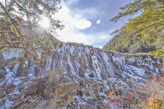 这是1月4日在四川省九寨沟风景名胜区拍摄的诺日朗瀑布形成的冰瀑景观。当日,中国九寨沟第十九届国际冰瀑旅游节开幕式在四川九寨沟风景名胜区举行。景区内特有的蓝色冰瀑,在冬日暖阳的照射下氤氲着水汽,让游客沉浸于九寨沟的冬季魅力。新华社记者 王曦 摄