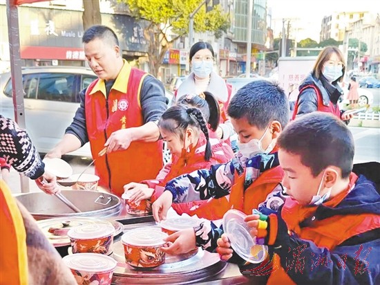 当天清晨,志愿者们精心熬制营养丰富的腊八粥,并将热粥送给民警、交警、环卫工们,传递关心关怀,感恩他们辛苦付出。现场还有很多穿着红马甲的小学生,帮忙给腊八粥封装、分袋(如图),送上冬日的温暖。