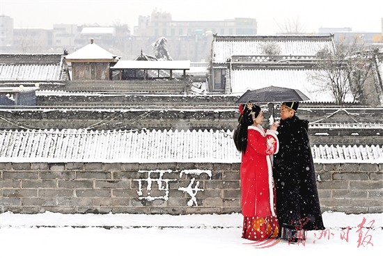 1月16日,游客在西安城墙观景赏雪。当日,西安迎来降雪。