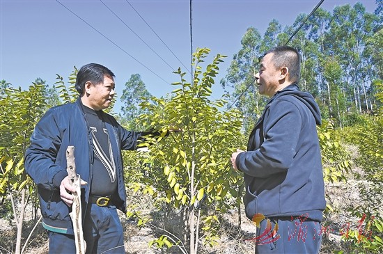 在仙游县社硎乡湖洋村,福建檀农林业有限公司董事长张世权(左)和技术人员在查看结香情况。 全媒体记者 林罗晓 摄