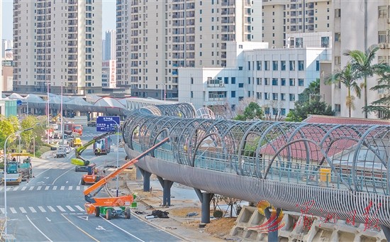 ▲龙德井片区空中连廊项目建设进入扫尾阶段。 全媒体记者 陈斌 摄