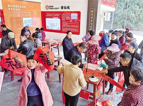 当日,由省中华职教社和湄洲湾职业技术学院共同组织的多名书法家在南兴村非物质文化遗产展台上激情挥毫。村民们闻讯围聚而来,现场暖意融融。书法家们书写了一副副寓意新春祝福的喜庆春联,作品或浑厚端庄、或雄健洒脱、或骨力遒劲,写出了对美好生活的向往和期盼,将喜气、福气、运气送到村民手中。村民们捧着字迹飘香的春联赞不绝口。73岁的蒋文辉老人接过书法家专门为他书写的“福到家门”,激动地说,他要把这张书法作品装裱起来,希望一年四季都充满福气。