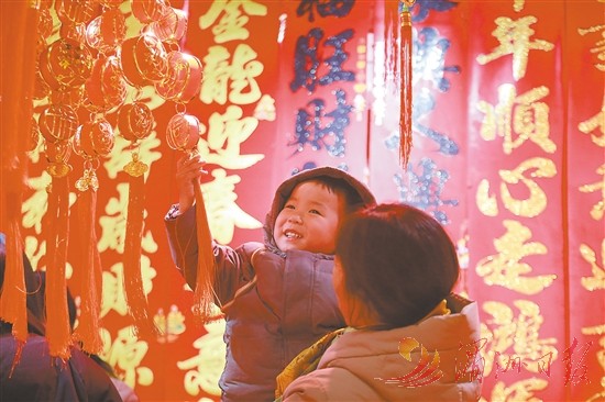 1月28日,在江苏省扬州市一家小商品市场,市民带着孩子选购春节饰品。春节临近,各地营造出浓浓的喜庆氛围,红红火火迎新春。