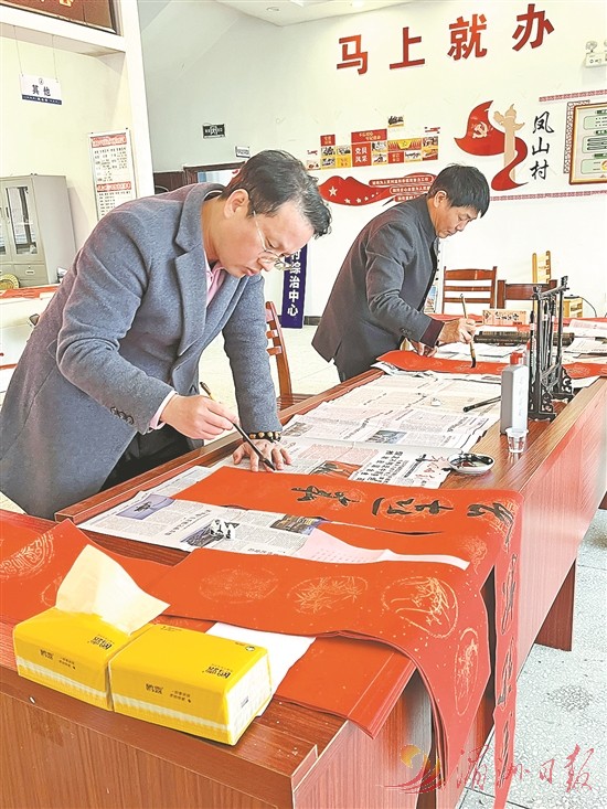 当日,凤山村村部人头攒动,福州大学厦门工艺美术学院党委委员、团委书记陈振兴,学院科技开发办公室主任程郑毅,绘画系讲师、中书协会员张瑞敏一行铺纸运笔,为村民书写春联。活动共送出100多副春联,营造了欢乐祥和的新春气氛。