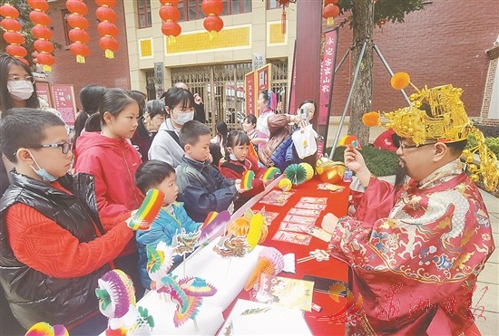 2月3日,“莆阳开春·龙腾福跃”2024年莆田市春节元宵文化旅游活动在兴化府历史文化街区启动,现场举办省市非遗文化展,邀请多地的非遗传承人进行现场活态展示。图为福州郭氏纸翻花第十六代传人郭远峰指导儿童演示纸翻花。全媒体记者 林英 摄