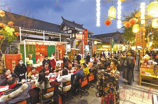 2月4日拍摄的活动现场。当日,有成都“城市会客厅”之称的宽窄巷子举行“在成都,遇见中国年——十二月市年夜饭 温暖幸福年”活动,环卫工人、快递小哥、大运会志愿者、高新技术人才、国际友人等48位嘉宾欢聚12桌“家宴”,在民俗表演中享美食、迎新春。新华社记者 江宏景 摄