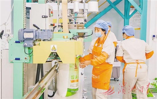 图为福粮面粉厂工人对加工好的面粉进行包装处理。