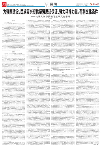 作为习近平新时代中国特色社会主义思想的文化篇,这一重要思想为全面推进强国建设、民族复兴伟业提供了坚强思想保证、强大精神力量、有利文化条件。