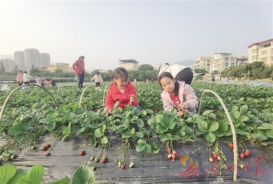 眼下正是草莓成熟季,我市各农业生态园的草莓进入采摘期,吸引不少家长带孩子体验休闲采摘乐趣。图为上周末,在西天尾一处草莓种植基地,孩子们在田间采摘草莓。 全媒体记者 林英 摄