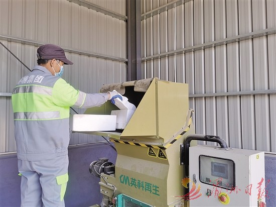 近年来,由于快递、外卖行业的快速发展,加上海上养殖设施升级改造,湄洲岛回收的泡沫垃圾呈现增长趋势,目前每日废弃泡沫回收量约为5立方米。因废弃泡沫体积大、回收难、运输不便,加上回收价值低,往往容易被随手抛弃。为此,市环境集团湄洲岛项目公司引进环保型泡沫冷压机,为这些低价值垃圾找到“出路”,也为回收提供更大便利。