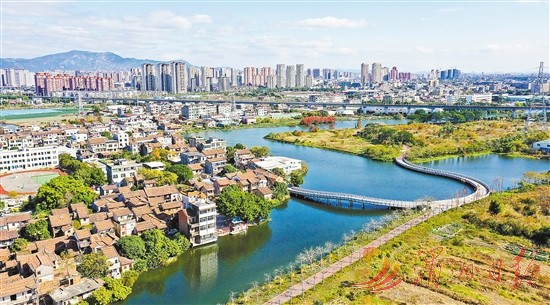 涵江福道串联城涵河道、白塘湖,经过洋尾村、陈桥村、上梧村、东墩村等多个村庄,当地通过联动水文、生态、人文、产业等要素,建设特色十里文化滨水长廊。图为近日,航拍下的城涵河道生态文化走廊精品示范段。