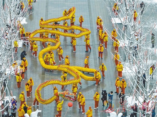2月5日,人们在安徽省肥东县包公故里文化园中表演国家级非遗项目“肥东洋蛇灯”。春节临近,各地张灯结彩,年味渐浓,人们通过舞龙舞狮、写春联、观灯展等方式喜迎新春佳节。新华社 发