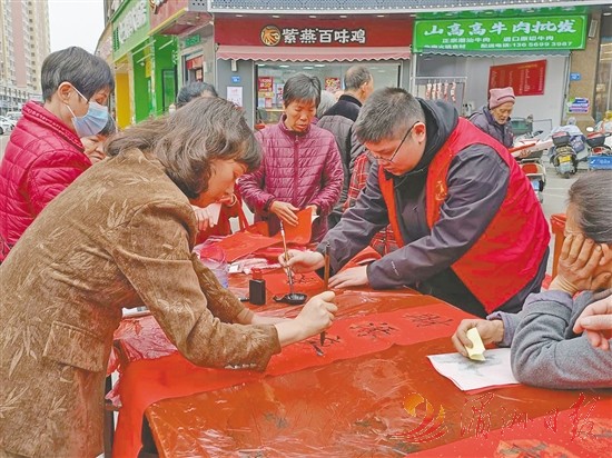 活动当日,来自市美术家协会、城厢区文化馆、城厢区教师进修学校的书法家们齐聚一堂,共同挥毫,气氛热烈。寓意吉祥的春联、饱含神韵的“福”字跃然纸上,浓浓的年味儿扑面而来。闻讯赶来的社区居民争相邀请书法家们“定制”春联,有的围在长桌旁驻足欣赏,有的就近找了平地,将春联平铺在地上晾干,脸上笑容洋溢。