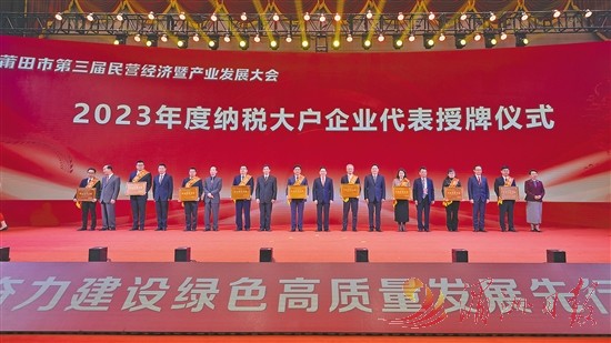 莆田市第三届民营经济暨产业发展大会昨日举行。图为2023年度纳税大户企业代表授牌仪式现场。 全媒体记者 陈斌 摄