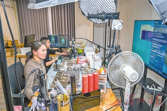 节后,我市各地真抓实干助推“开门红”“开门稳”。图为昨日,黄石工艺美术城汇安沉香直播间里,主播们正在网上销售沉香产品。