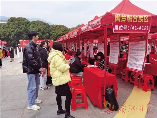 招聘会首设的闽台融合专区,吸引许多应聘者前往了解应聘。