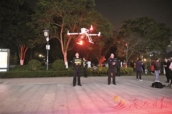 民警放飞警用无人机,巡逻喊话,护航活动安全。全媒体记者 杨怡玲 摄