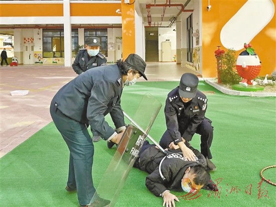 民警还重点走访校园周边,对零食店、饮料店等开展食品、消防安全检查。严格组建校园最小应急单元,完善应急处置机制,对校园安全专干、安保人员进行岗位技能培训,开展应急处置演练,实现全市培训、演练全覆盖,全面提升校园安防水平(如图)。