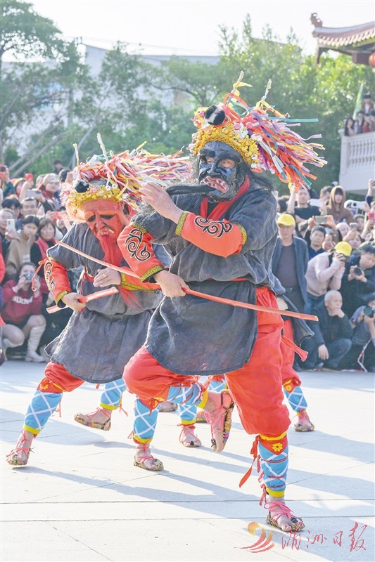 当天14时30分许,枫亭镇麟山宫广场人山人海,军鼓队、八仙戏队、马队、十音八乐队等民俗表演轮番上演。之后,非遗民俗“皂隶舞”热闹上演,赢得观众阵阵喝彩。