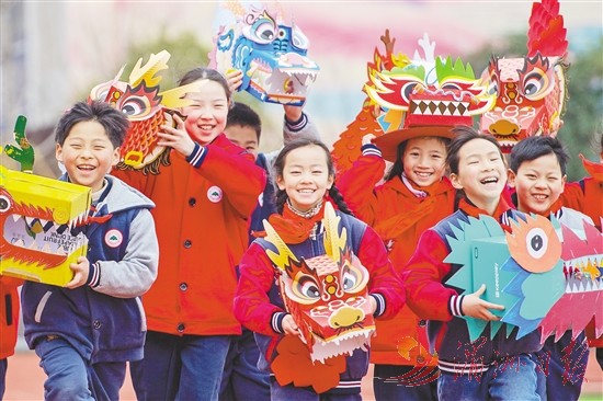 2月26日,在浙江省湖州市长兴县实验小学龙山校区,学生们展示自己寒假期间手工制作的纸盒龙。当日,全国多地中小学开学,师生迎接新学期的开始。新华社 发