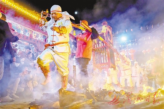 晚八时许,元宵巡游队伍返回安宁宫时,参与蹈火的轿郎,身着白色战衣,头扎英雄巾、腰束英雄结、脚蹬粉底靴,紧袖裹腿,严阵以待。待到火塔燃起熊熊烈火,火势最旺时,在铿锵的锣鼓声中,轿郎们抬着棕轿撞倒熊熊燃烧的火塔,勇敢无畏地蹈火而过,围观群众喝彩连连。来自上海的游客陈健榕激动地说:“今晚看到抬轿撞火感到十分震撼,那种生活的朝气,勇往直前的魄力,就是中国风格。”