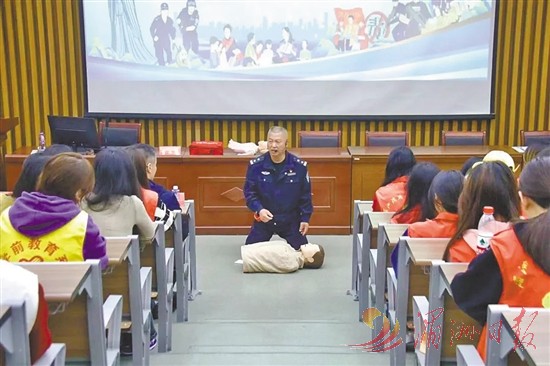 李海东在现场边示范边耐心讲解心肺复苏(如图)。他说,坚持义务宣传应急救护知识的初衷是希望每个人都学会这项急救技能,多教会一个人,就多一分希望。5年来,他进学校、进企事业单位、进机关、进村居,共开展648场次志愿服务活动,其个人志愿服务时长3169小时。让更多人掌握急救技能技巧,就能在事发现场挽救生命和降低伤害程度。他说:“学会‘急救’,才能‘救急’,更好地践行雷锋精神。”