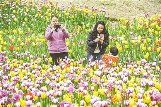 3月9日,在位于重庆市长寿区的长寿湖景区,游客在郁金香花海中拍照。近日,位于重庆市长寿区的长寿湖景区郁金香盛开,成为游客踏青赏花游玩的热门景点。长寿湖景区从2014年开始每年举办郁金香花展,吸引了大量游客观赏。