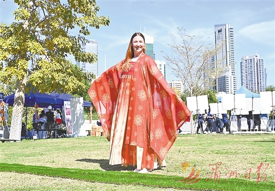 3月9日,在科威特首都省贾比尔文化中心,一名女子体验中国传统服饰。当日,一场丰富多彩的中国文化美食节在科威特贾比尔文化中心举行。 新华社 发