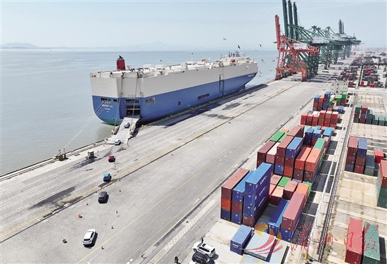 3月12日,准备出口的车辆从福州港江阴港区码头驶上远洋滚装轮。当日, 4000辆上汽集团乘用车福建宁德基地生产的汽车陆续驶上停靠在福州港江阴港区码头的“安吉智慧”号滚装轮。据介绍,这是福建省单航次装载量最大的一批出口汽车,包含新能源汽车2800辆,占比70%。 新华社 发