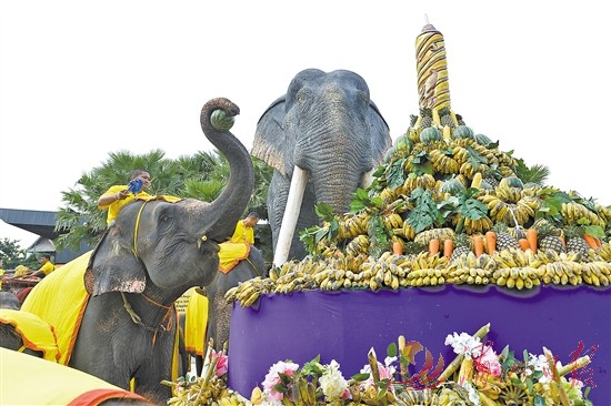 3月13日,在泰国芭堤雅东芭乐园,大象享用水果自助餐。当日是泰国一年一度的大象日,芭堤雅东芭乐园在这一天为大象奉上了丰盛的水果自助餐。新华社 发