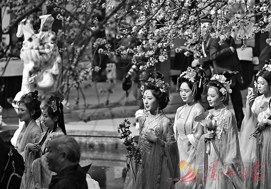 3月15日,第33届天津运河桃花文化商贸旅游节开幕式在红桥区举行。位于天津红桥北运河畔的桃花堤桃花初绽,人们三五成群地漫步其中,欣赏春日美景。图为演艺人员身着汉服在天津桃花堤漫步。 新华社 发