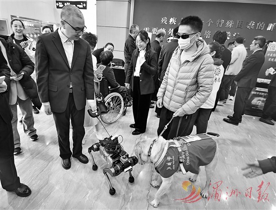 近日,在汇爱科技展上,“电子导盲犬”与导盲犬相遇。当日,由北京市残疾人联合会主办的“科技赋能 畅享未来”首届汇爱科技展在北京市残疾人服务示范中心开幕。电子导盲犬、室内无障碍导航系统、AI数字手语人、外骨骼机器人、脑机接口康复技术、智能机械手等二十余种国产高新科技助残产品在科技展上进行了展示。 新华社 发