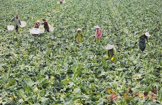眼下,我市各地抢抓农时,开展春耕备种、田间管护、春收等春季农业生产。图为涵江区白塘镇洋尾村农户在田间采收花菜。 全媒体记者 陈斌 摄