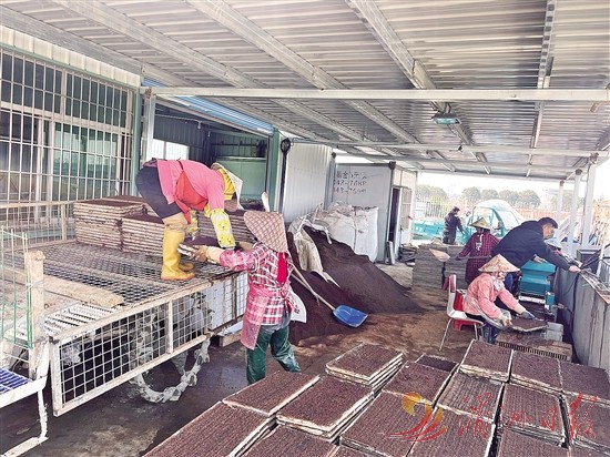 位于徐厝村的水稻育秧基地满目青翠,生机盎然。记者在现场看到,水稻播种精量育秧生产线上,自动上秧盘、铺底土、浇水、播种、覆土、叠盘等工序有条不紊进行,不到1分钟就制好10余个育秧盘,大大简化手工育秧的繁琐程序。
