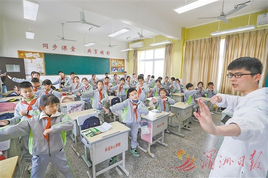 4月7日,在浙江省湖州市德清县钟管小学,钟管镇中心卫生院的医生带领学生练习课间健康操。当日是世界卫生日,国家卫生健康委将中国宣传主题定为“人人享健康 共同促健康”。各地举行形式多样的主题活动,倡导良好的卫生习惯和健康的生活方式。新华社 发