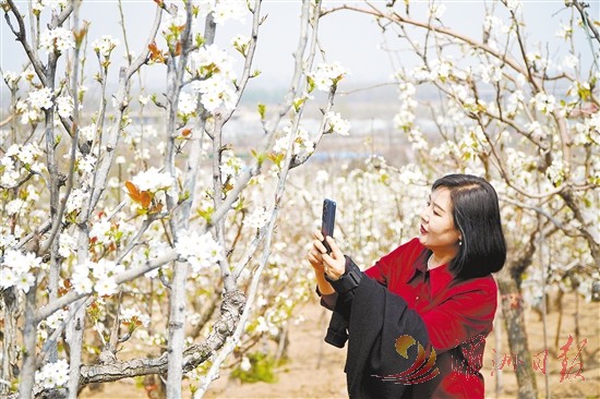 4月9日,在山东潍坊昌邑市饮马镇的博陆山古梨园,游客拍摄盛开的梨花。近日,山东潍坊昌邑市饮马镇的博陆山古梨园内梨花盛开,吸引众多游客前来赏花游览。博陆山古梨园占地2000余亩,园内有树龄超过300年的梨树5000多棵。 新华社记者 徐速绘 摄