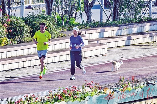 春光里,市民们在木兰溪畔跑步锻炼,连小狗也没闲着。