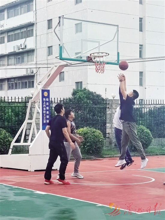图为船员在服务驿站打篮球,放松身心。