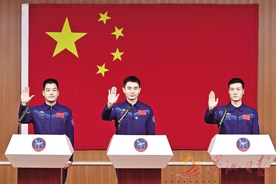 4月24日,神舟十八号载人飞行任务航天员叶光富(中)、李聪(右)、李广苏在酒泉卫星发射中心问天阁与中外媒体记者集体见面。 新华社 发