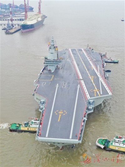 5月1日8时许,我国第三艘航空母舰福建舰从上海江南造船厂码头解缆启航,赴相关海域开展首次航行试验。这是拖船正在将福建舰拖离码头(无人机照片)。新华社 发