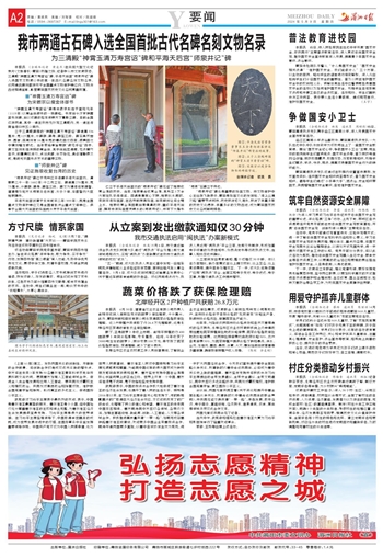 本报讯 (全媒体记者 黄凌燕)在央视大型文化纪录片《文脉春秋·莆田》热播之际,记者昨从市文旅局获悉,三清殿“神霄玉清万寿宫诏”碑、平海天后宫“师泉井记”碑入选国家文物局公布的第一批古代名碑名刻文物名录。这两通古碑刻都存放于全国重点文物保护单位内,文物与古迹相得益彰,彰显莆田国家历史文化名城厚重底蕴。