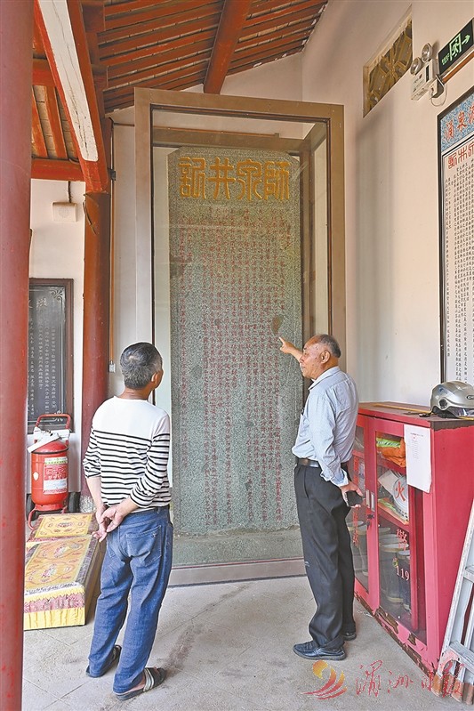 图①:平海天后宫常务董事长王金寿向游客讲述“师泉井记”碑背后的故事。
