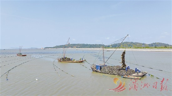 我市大力发展海带、紫菜、生蚝等特色海上养殖,促进渔民增收、渔村振兴。图为连日来,湄洲湾北岸养殖户驾驶作业船,穿梭在一排排海上“田垄”中,忙着收割海带。全媒体记者 陈斌 摄