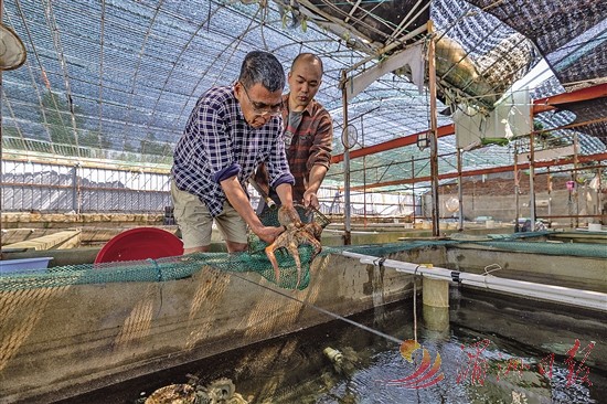 位于埭头镇井厝村的中华蛸育苗基地,朱友芳培育的中华蛸仅过半年,平均体重就达到1公斤以上。 全媒体记者 陈斌 摄