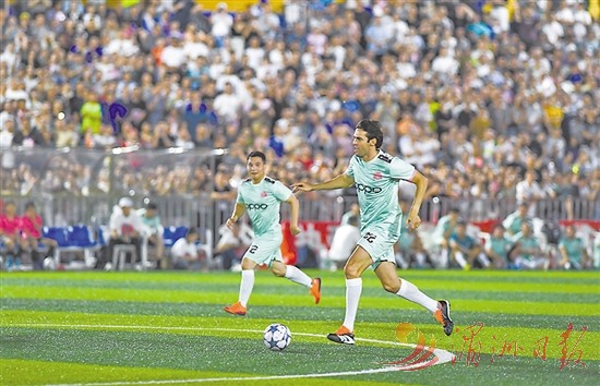 5月27日,卡卡(右)在“逐梦”冠军明星公益赛中。当日,“逐梦”冠军公益赛在贵州省黔东南苗族侗族自治州榕江县“村超”球场举行。巴西足球名宿卡卡、中国女足前队员王坤等亮相球场。 新华社记者 杨文斌 摄