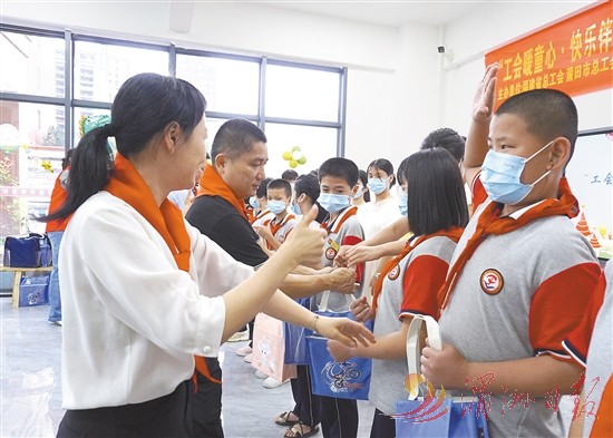 “六一”节前夕,涵江区总工会组织区法院、莆田中建公司等来到市特殊教育学校慰问。图为志愿者为孩子们送上学习大礼包。