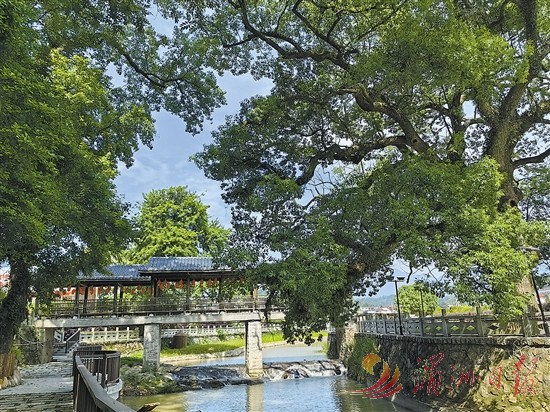 图为在象星村,清溪、大树与廊桥构成一幅美景。