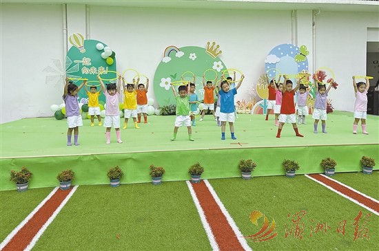 日前,梅峰小学附设玉湖幼儿园举办集体生日会,孩子们载歌载舞共同庆祝“六一”国际儿童节。图为孩子们表演舞蹈《运动真奇妙》。关秀凤 林燕青 摄
