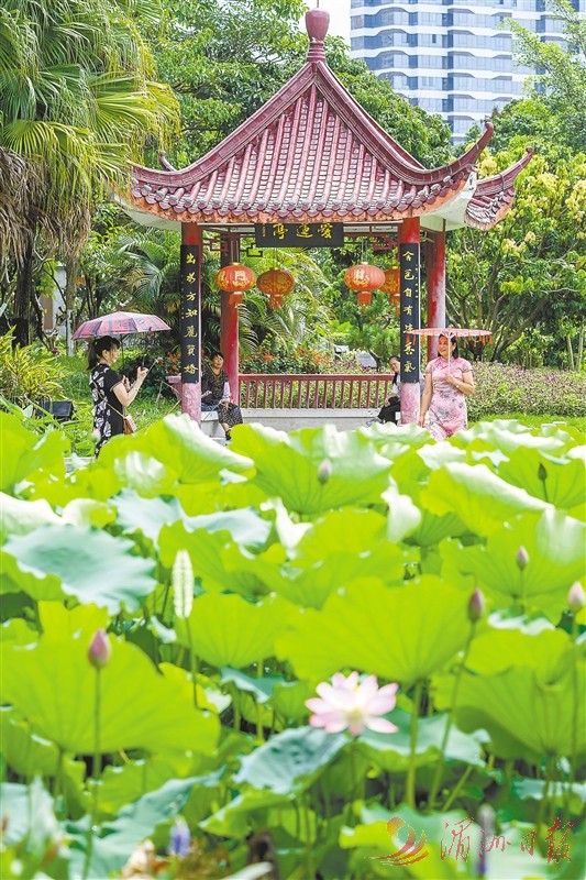 端午过后,市区绶溪公园荷花盛放,吸引许多游客赏花。图为游客在荷花池旁游玩。全媒体记者 蔡昊 摄