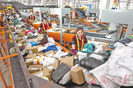 6月18日,在浙江省湖州市长兴县星网电子商务创业园一家快递企业,工作人员忙着分拣、扫描出库等工作。时值电商平台“618”年中促销活动高峰,各地电商、物流等线上线下企业、商家全力应对。 新华社 发